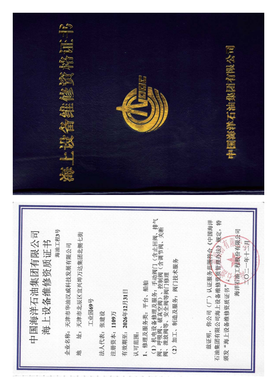 • 中海油海上设备维修资质证书